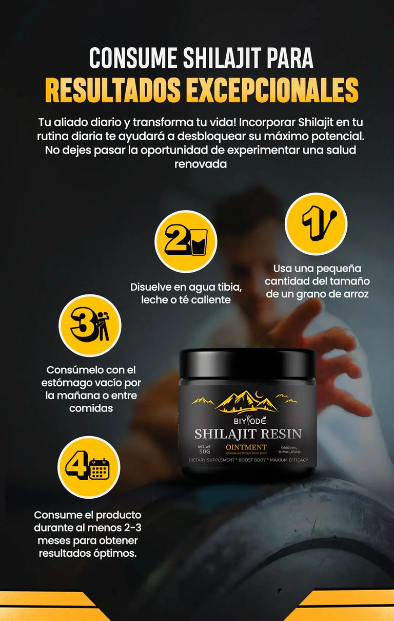 ¡Nuestro Shilajit 100% Puro del Himalaya es una fuente natural que eleva tu energía, proporcionándote vitalidad renovada y un impulso completo para enfrentar tus actividades diarias con mayor vitalidad!